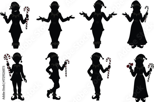Christmas elf silhouettes holding candy canes festive holiday vector illustration playful characters winter decoration design isolated black silhouette artwork