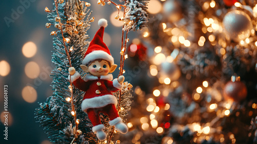 christmas, elf, swinging, string, massive, pine tree, festive, decoration, holiday spirit, whimsical, playful, joy, celebration, cosy, tree, holiday, snowman, santa, winter, christmas, snow, toy, gift, christmas tree, ornament, seasonal, season, claus, december, ball, new year, tree branch, happy, green, pine, year