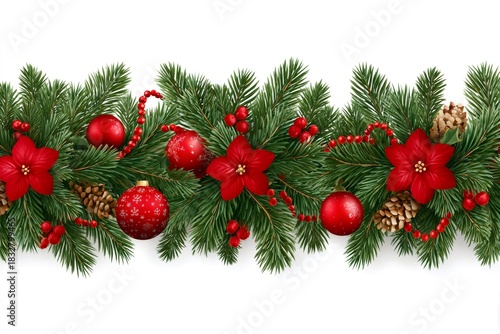 christmas, garland, decoration, festive, christmas flower, pine, ornament, red, green, holiday, celebration, winter, season, new year, merry, happy, background, border, frame, white, isolated, element, tree branch, spruce, fir, traditional, vibrant, colourful, berry, bauble, ball, shiny, ribbon, design, graphic, vector, illustration, greeting, card, invitation, banner, template, decor, space, copy, abstract, texture, natural, flora