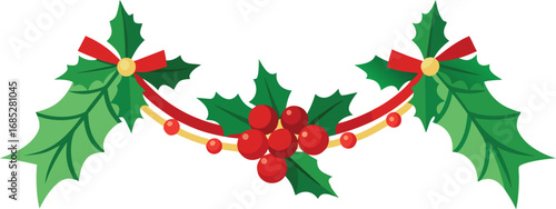 Christmas fir garlands, red bow and jingle bells. Flat vector illustration on transparent background