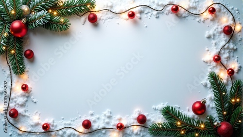 Christmas Garland and Twinkling Lights on Snowy Surface with copy space.