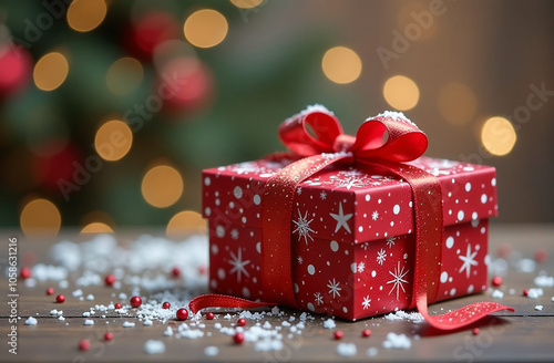 Christmas gift box with red ribbon and snowflakes on bokeh background