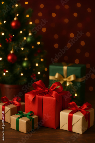 Christmas Gift Boxes with Bokeh Lights and Festive Decor
