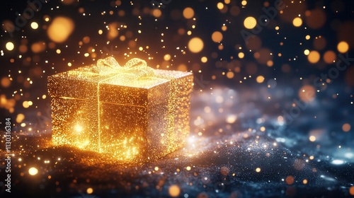 christmas, present, gift, holiday, winter, snow, light, bokeh, ribbon, wrapped, pine, tree branch, celebration, festive, season, december, magic, surprise, giving, tradition, decoration, greeting, card, background, new year, eve, blue, gold, glistering, sparkle, dark, night, cosy