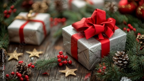 Christmas gifts and decorations on a wooden surface, featuring a large silver gift box with a red bow