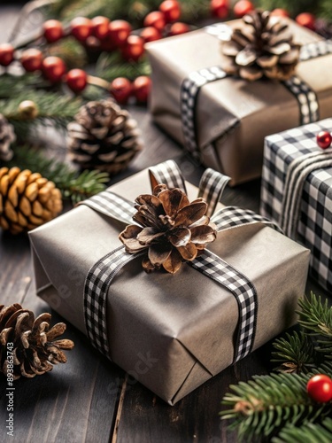 christmas, gift, present, holiday, decoration, festive, winter, celebration, season, december, christmas, wrapped, box, ribbon, bow, pine cone, fir, tree branch, holly, berry, wood, rustic, background, greeting, card, banner, website, surprise, joy, giving, tradition, family, love, cosy, warm, happy, new year, eve, magic, sparkle, ornament, design, style, cardboard box, paper, green, red, brown