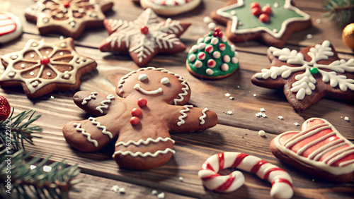 Christmas gingerbread cookies, festive, decorated with colorful icing and candy, capturing a joyful holiday spirit