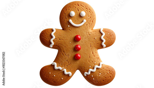 Christmas gingerbread man cookie with white icing and red candy buttons, festive holiday treat