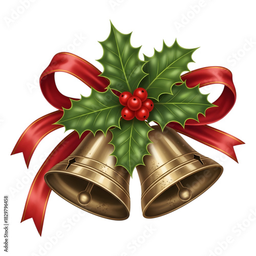 Christmas golden bells with festive red ribbon and vibrant green holly berries, holiday season decoration illustration art