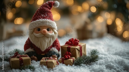 Christmas greeting card. Christmas decoration with Santa Claus toy and gift box on bokeh background. Christmas background. Christmas greeting card with Santa Claus toy and gift box on bokeh background