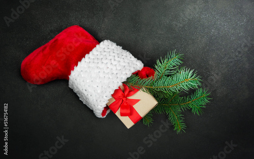Christmas greeting card red stocking with a fir branch and a gift on a black background