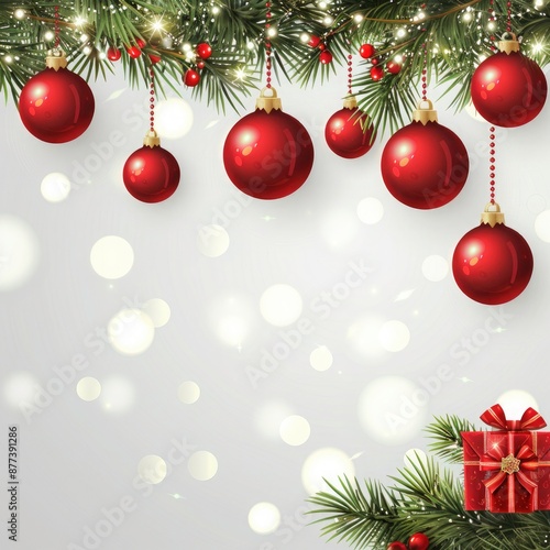 Christmas greeting template with Christmas decorations, red balls and gifts hanging on white background. Xmas decoration for greeting card or web banner