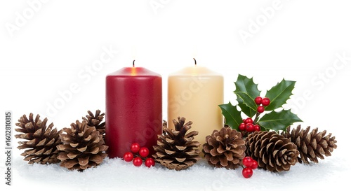 candle, candle, red, cream, pine cone, pine cone, holly, berry, holiday, decoration, christmas, winter, still life, isolated, arrangement, decorative, display, background, white, red berry, texture, light, image, photo, simple, elegant, composition, winter scene