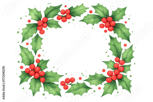 Christmas holly wreath watercolor drawing with bright red berries and green leaves, festive holiday illustration frame
