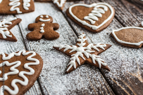 Christmas homemade gingerbread cookies on a wooden background. New year and christmas postcard
