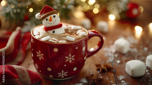 Christmas Hot Chocolate with Marshmallow Snowman and Bokeh Lights