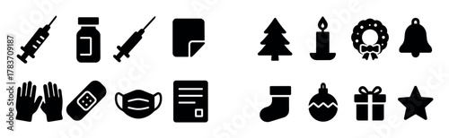solid, icon, stocking, christmas, ornament, candle, object, tree, bell, gift, star, chaplet, glyphs, isolated, bold, icon, negative, pictogram, filled, simple, silhouette, vector