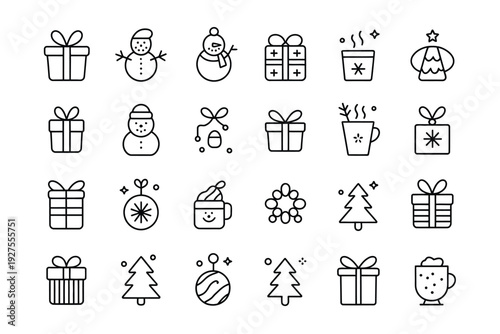christmas, icon, line art, gift, present, snowman, tree, festive, holiday, winter, decoration, ornament, mug, hot chocolate, wrapping, bow, ribbon, minimalistic, vector, illustration, simple, black, white, graphic, design, element, symbol, logotype, christmas gift, christmas tree, christmas decoration