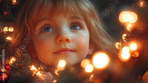 Christmas Lights Sparkle in Child's Eyes: A close-up portrait of a young girl, captivated by the twinkling lights of a Christmas tree, her eyes reflecting the magic and wonder of the holiday season.