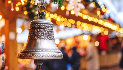 bell, christmas, holiday, market, festive, gold, metal, ornament, decor, hanging, light, warm, pattern, intricate, design, vintage, decoration, seasonal, celebration, people, background, blur, illumination, holiday season, winter, warm light, out of focus, detail, closeup, image, photo, copy space