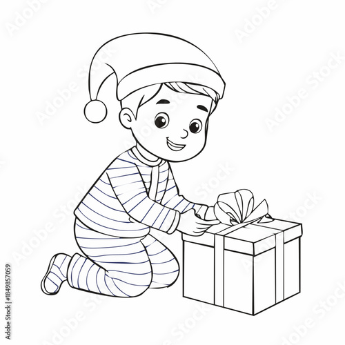 Christmas morning: A young child with festive nightwear, kneels in anticipation, eagerly opening a perfectly wrapped gift box, filled with holiday cheer.