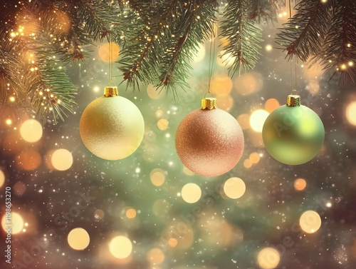 Christmas Ornaments Hanging on a Fir Tree Branch with Sparkling Lights