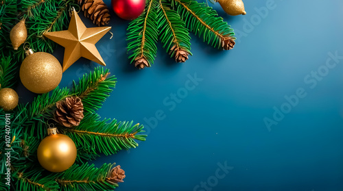 Christmas Pine Branches and Golden Ornaments on Blue Background - Elegant Holiday Decor with Pine-cones and Star