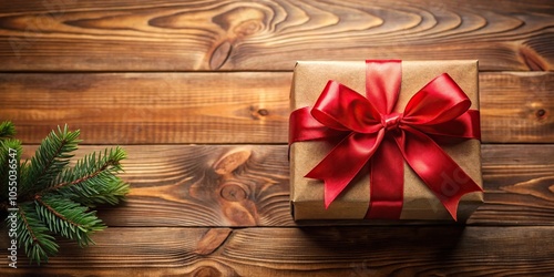 Christmas present wrapped with red bow on a decorated wooden table