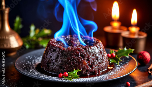 brandy, flames, blue, fire, burning, traditional, holiday, festive, dessert, sweet, treat, aromatic, sauce, presentation, serving, luxury, elegance, celebration, feast, main course, delicious, epicure, cookery, family, gathering, decoration, ambience, warmth, hospitality, culinary, art, craftsmanship, detail, texture, appetence, indulgence, nostalgia, heritage, winter, season, cheer