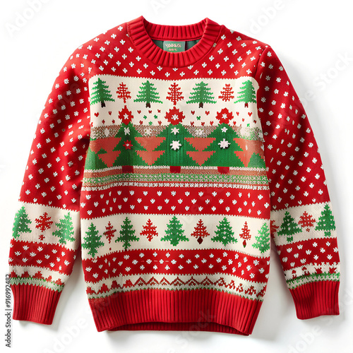 Christmas red knitted sweater with a pattern of fir trees and snowflakes on a white background