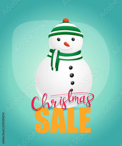 Christmas sale poster design with a cute snowman. Vector illustration.
