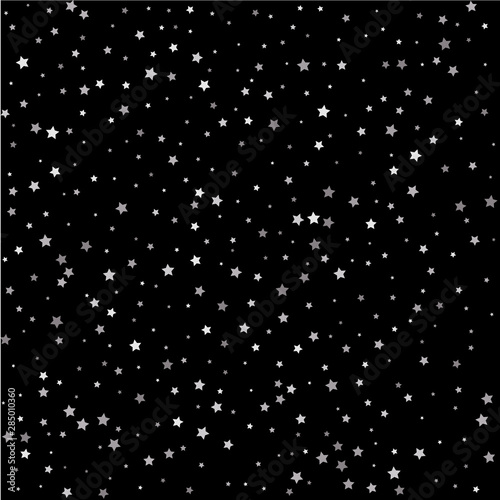Christmas stars background vector, flying silver sparkles confetti. Festival decor.