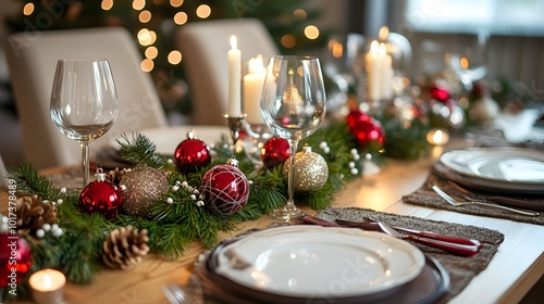table, setting, christmas, pine, branch, candle, ornament, red, silver, gold, glasses, wine, goggles, plate, white, wooden, decor, festive, holiday, dinner, celebration, elegant, cosy, warm, sparkle, glow, light, bokeh, blur, background, merry, joy, cheerful, traditional, winter, december, peace, family, love, season, spirit