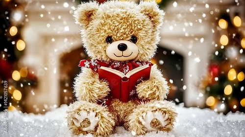 christmas, snow, book, reading, warm, cosy, festive, light, fireplace, winter, soft, plush, toy, gift, adorable, cute, cheerful, joyful, holiday, celebration, ambience, decoration, present, sitting, stuffed, seasonal, tradition, love, happiness, character, imagination, childhood, memory, sweet, tender, gentle, peaceful, playful, warmth, comfort, family