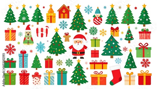 christmas, festive, icon, tree, gift, decoration, snowflake, santa, gnome, house, present, collection, flat, design, colourful, red, green, blue, yellow, orange, pattern, ornament, symbol, holiday, winter, celebration, cartoon, cute, simple, modern, illustration, graphic, vector, element, background, set, digital, flattened