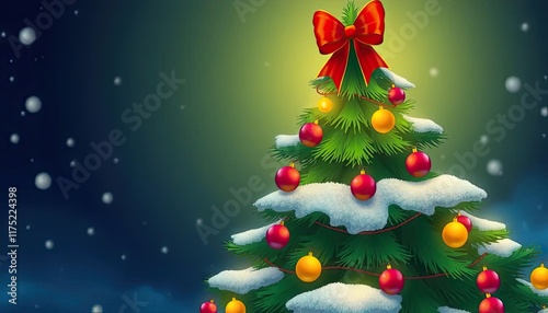 Christmas tree decorated with snow, lights, and ornaments, against starry night background, perfect for holiday greeting cards
