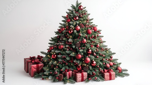 Christmas Tree Delights: An evergreen tree adorned with vibrant red ornaments, surrounded by neatly wrapped gifts, captures the spirit of the festive season. A symbol of warmth and cheer.