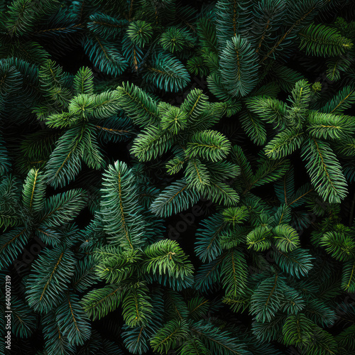 Christmas tree flat lay background, coniferous tree branches. Fir and pine branches with copy space.