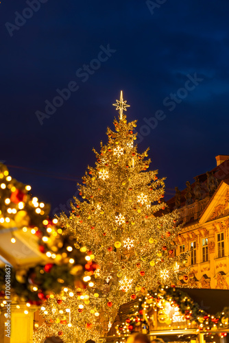 prague, christmas tree, christmas, czech republic, twilight, illumination, light, decoration, winter, holiday, festive, celebration, night, europa, travel, tour tourism, weihnachtsmarkt, traditional, season, december, gold, star, christmas lights, exterior, landmark, architecture, evening, vertical, no people, illuminated