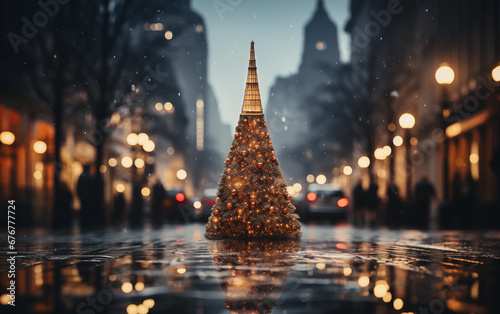 Christmas tree new year on blurred cityscape winter background Generated AI
