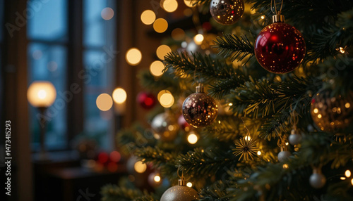 Christmas Tree With Baubles And Blurred Shiny Lights