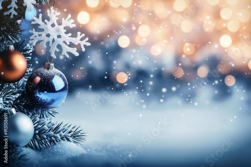 Christmas Tree with Blue and Silver Ornaments in Snowy Setting Creating a Festive Holiday Atmosphere with Bokeh Lights
