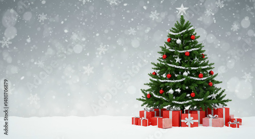 christmas, tree, gift, snowflake, silver, background, winter, holiday, decoration, celebration, christmas, season, new year, ornament, snow, festive, present, december, fir, pine, gift, celebrate, traditional, card, greeting, eve, merry, party, decor, design, bright, space, illustration, copy space, white, cold, shiny, elegant