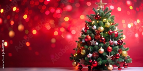Christmas Tree With Ornament And Bokeh Lights In Red Background