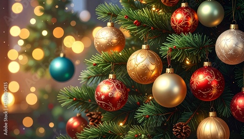 Christmas tree with red, gold, and blue baubles, pinecones, glowing lights, and festive background.