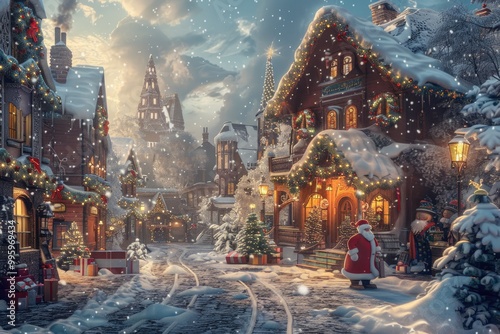 Christmas Village Winter Scene with Festive Decorations and Snowfall