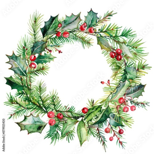 Christmas Wreath Watercolor. Chaplet of Spruce, Holly Berries, and Mistletoe for Holiday Decor
