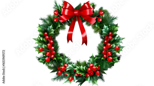 christmas, chaplet, holly, berry, red, green, decoration, festive, holiday, seasonal, winter, bow, ribbon, celebration, ornament, greeting, december, christmas, tradition