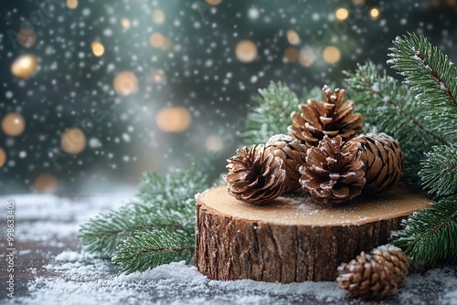 Christmas-themed image featuring snow-dusted pinecones arranged on a wooden stump, surrounded by evergreen branches, with a soft, snowy background and bokeh lights