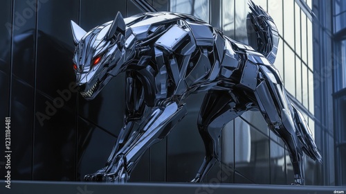 robot, wolf, canino, metallic, chrome, steel, futuristic, technology, cybernetic, artificial, intelligence, animal, predator, digital, rendering, three-dimensional, model, science, fiction, fantasy, urban, city, building, structure, glasses, modern, dark, night, shadow, red, eye, glowing, menacing, powerful, strong, fierce, aggressive, dangerous, mechanical, joint, gear, texture, detail, artwork, image, graphic, illustration, design